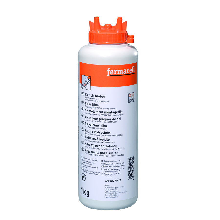 Fermacell® Vloerelementen worden door middel van een liplasverbinding met de Fermacell Vloerelementen montagelijm verlijmd (verbruikt ca. 40 à 50 g/m2, oppervlakte ca. 20 à 25 m2 per fles). Breng twee lijmstrengen op de liplas aan. Door de twee lijmtuiten op de fles kan dit in een beweging. Binnen 10 minuten wordt het volgende vloerelement op de liplas geplaatst en vastgeschroefd of -geniet. De Fermacell Vloerelementen montagelijm is na ca. 24 uur uitgehard (bij 20°C en luchtvochtigheid van 65%). Overtollige lijmresten na uitharding verwijderen met lijmafsteekmes of spachtelmes. Volle belasting van de Fermacell Vloerelementen na volledige uitharding van de lijm.